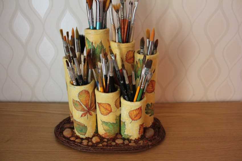 Еще один бюджетный вариант – использовать в качестве основы упаковку из-под чипсов. Минимальный декор поможет придать ей привлекательный вид. Кстати хранить в таком органайзере можно даже кисти для рисования.