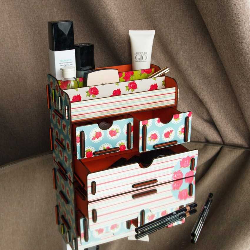 Сделать коробку для косметики можно из коробов различного размера, выставленных по назначению и собранных в одну большую. Заднюю стенку обычно выполняют выше передней. Этот способ размещения поможет удобно брать и класть необходимые предметы без помех. Также косметические средства не будут загораживать друг друга.
