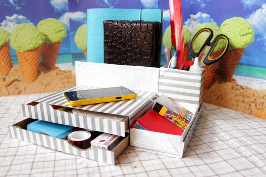 Самый простой, дешевый материал — обувные коробки. Они отличаются от обычного картона высокой прочностью. Не потребуется раскрой, соединение отдельных деталей. Нужно лишь подобрать подходящий размер. Для изготовления мелких органайзеров своими руками выбираем коробочки от детской, летней обуви. Огромное хранилище получается из упаковки от зимних сапог с длинным голенищем.