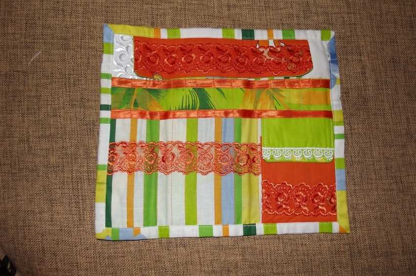 - Чтобы уплотнить органайзер, вырежьте еще точно такой же кусок ткани для основания, набейте ваш будущий органайзер тонким слоем синтепона и сшейте.