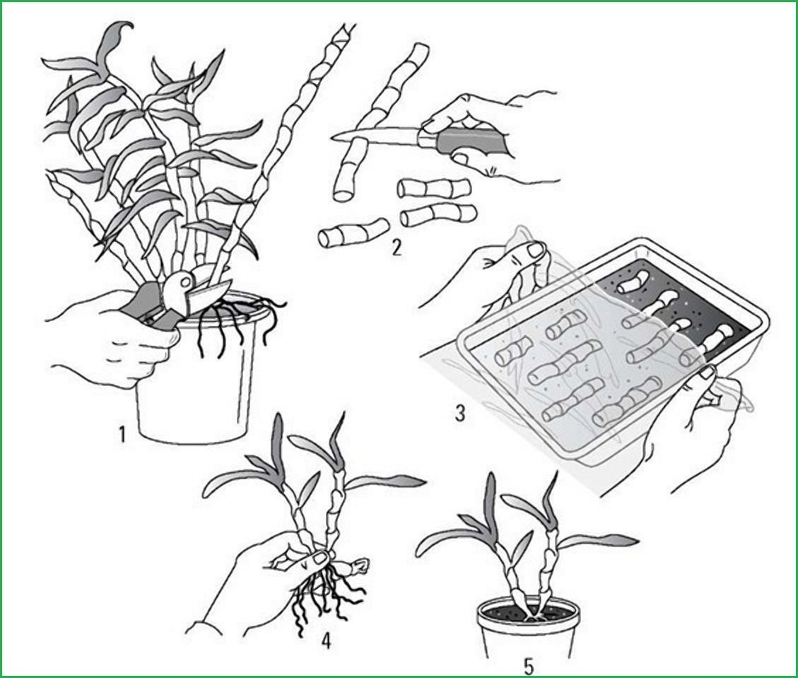 Способ с черенками подойдет сортам Эпидендриум и Ванда. Понадобятся боковые побеги длиной 10-15 см. Для обрезки используют острый нож, продезинфицированный спиртом или перекисью. Срез на черенке и растении присыпают углем. Черенок сажают в горшок срезом в грунт. Ухаживают за молодым растением так же, как и за зрелым.