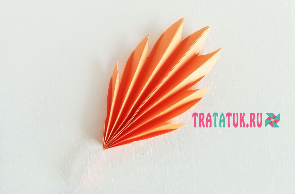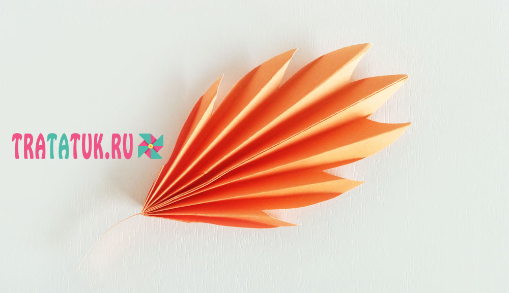 В завершении, лист гармошкой расправьте немного и приклейте черешок, в качестве которого тонкая полоска цветной бумаги из которого сделан и сам лист. Но такой стебелек не прочный, он может только дополнять листик, а, например, приклеивать листья к самодельному деревцу не выйдет. Лучше для этих целей использовать цветной картон, либо цветную бумагу, скрученную в жгутик и продетую сквозь отверстие в нижней части листа.