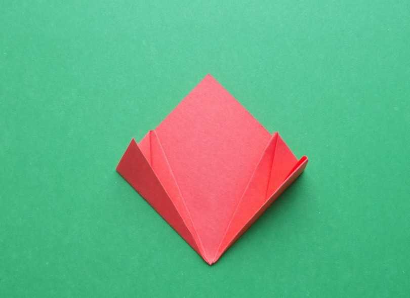 - Теперь каждую сторону отгибаем к центральной линии, делаем так со всех сторон. Далее разворачиваем эти уголки в противоположную сторону-это будут лапки.