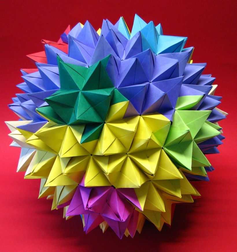 Еще одним способом искусно украсить интерьер своего дома являются цветочные композиции кусудама. Шарообразные бумажные букеты могут быть подвешены под потолок или же красиво смотреться в качестве декоративного элемента в любом месте жилища. Несмотря на внешнюю сложность, изготовление цветов оригами кусудама из бумаги по силам для начинающих. Как и в случае с модульной техникой, объемная композиция составляется из отдельных элементов, только на этот раз изготавливаются целые бутоны и листья. При помощи клея составляется сферообразная композиция, которую при желании можно украсить лентами и бусинами.