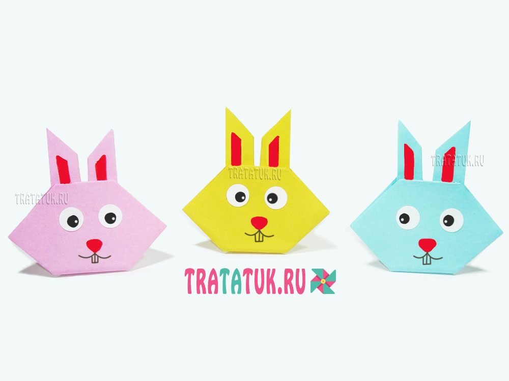 Кролик не в целостном виде, а только его голова. Несмотря на это смотрится он симпатично и ярко. Хороший вариант оригами для маленьких детей. Часто такой такой кролик относится к тематики пасхальных поделок.