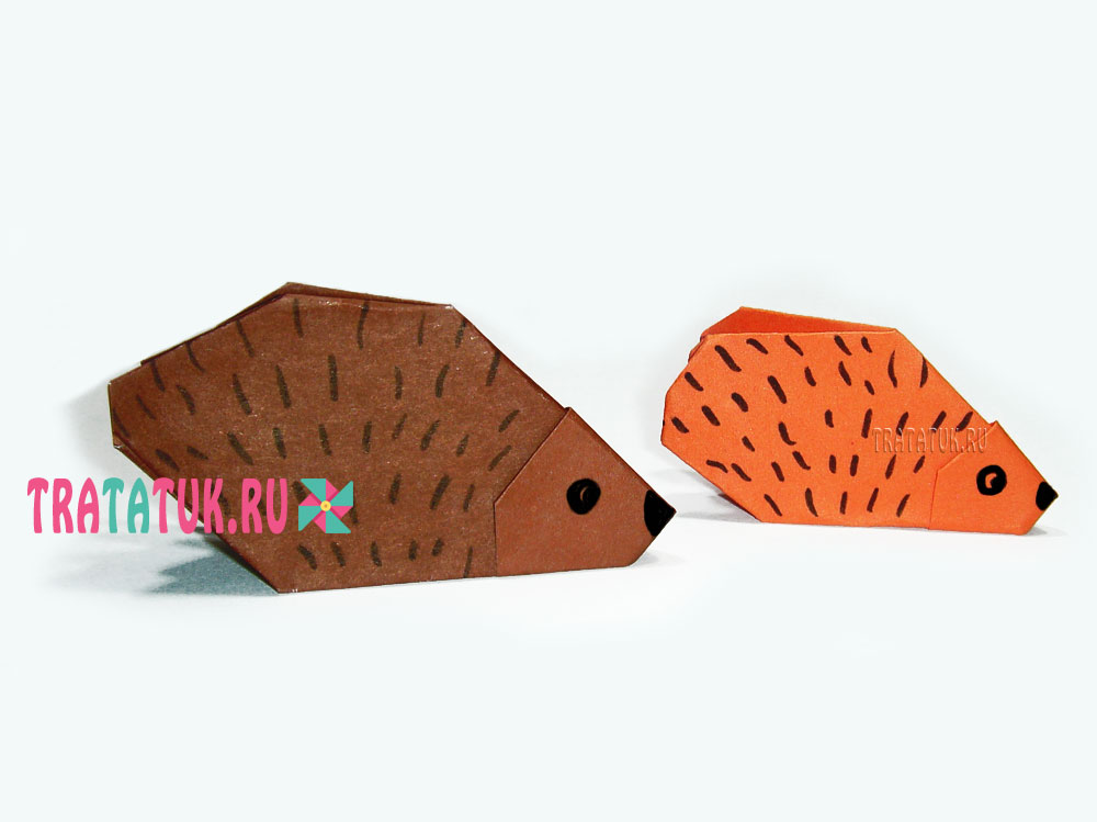 Такой ежик получится из одного квадратного отрезка бумаги. Несколько несложных действий – и работа готова. Обзор с фото прилагается.