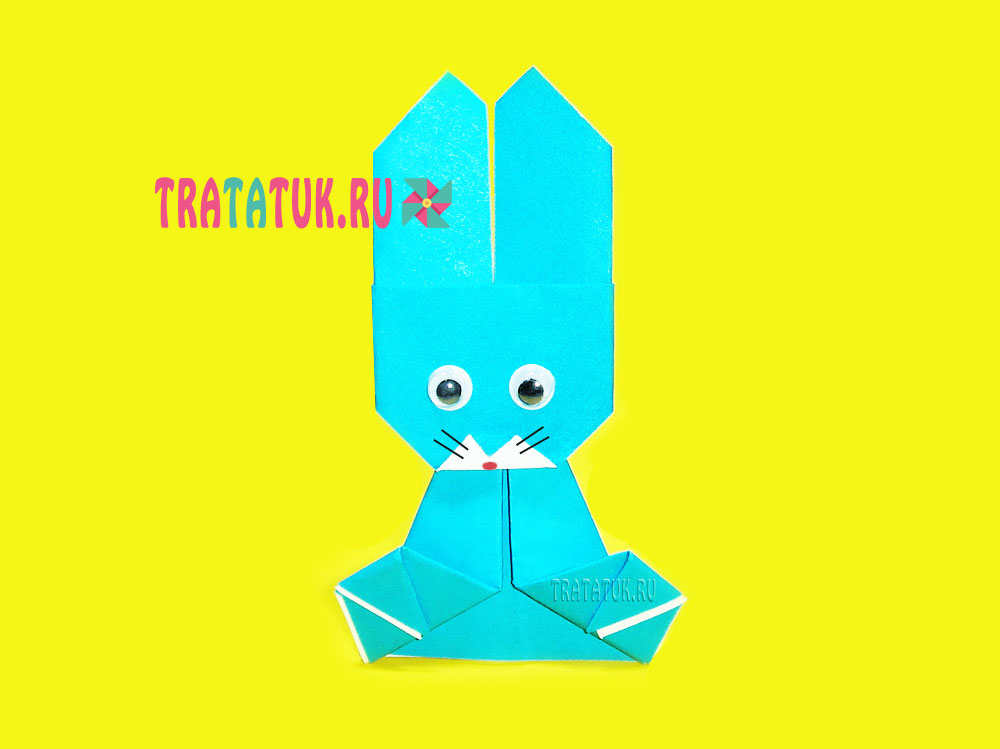 Такой милый зайчишка обязательно понравится детям. Он складывается из двух бумажных квадратов – по отдельности голова и туловище. После их нужно склеить вместе. Совсем несложная работа. В этом можно убедиться следуя ссылке на пошаговый обзор.