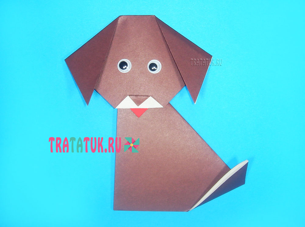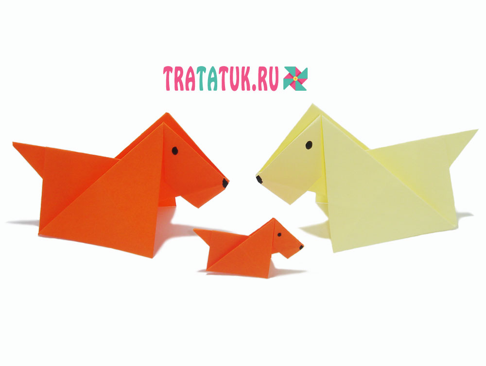 Есть много вариантов собак оригами. Этот идеален для детей. Состоит песик из двух частей – головы и туловища. После простых действий в их создании, части склеиваются вместе.