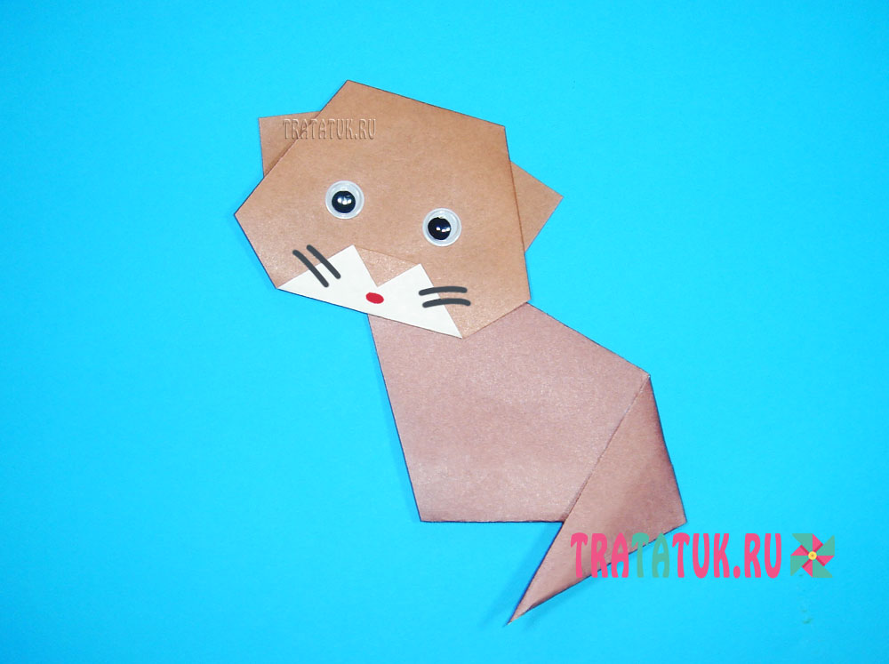 Переверните поделку. Осталось оформить мордочку по вашему желанию. Оригами кошка готова!