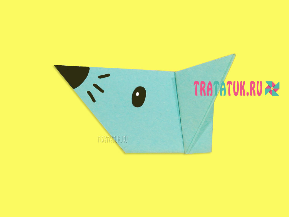 На изнаночной стороне спрячьте второй нижний конец и боковые части. Переверните. Нарисуйте глаза, мордочку, усы.
