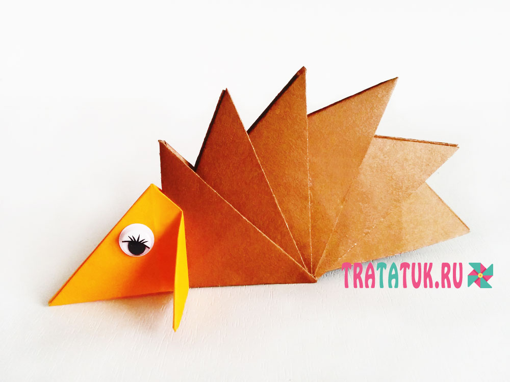 - Угол сгиба, как на самолетике, подогните вверх и согните так, чтобы образовался клюв. Нарисуйте глаз.