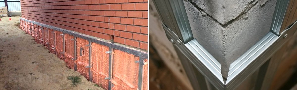 Чтобы обшить фундамент чаще всего используют длинные панели от 1,5 м. Поэтому устанавливается такой каркас чтобы размер ячейки составлял 50–60 см, если позволяет размер цоколя используют горизонтальные и вертикальные рейки, если нет, то только горизонтальные. Крепить профили нужно с использованием дюбелей.