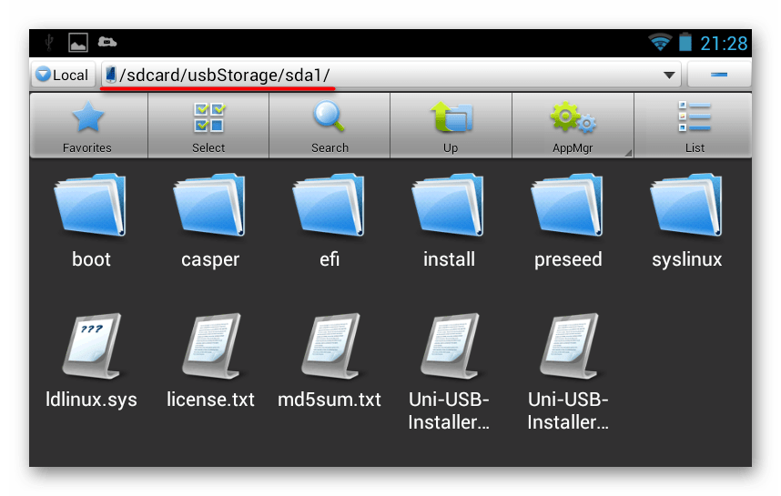 Посмотреть и скопировать содержимое флешки после монтирования можно через любой файловый менеджер. Информация будет находиться в каталоге sdcard/usbStorage.