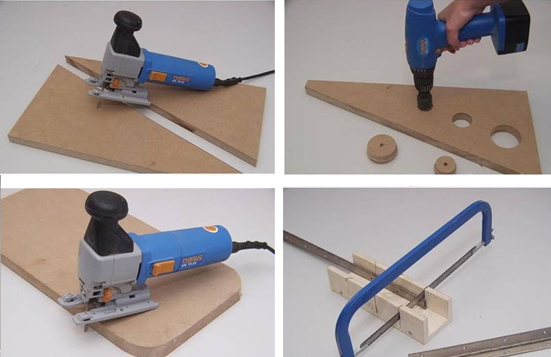 Обязательно нужен лобзик. Он поможет аккуратно и эффективно резать материал для стола. Заменить его можно ножовкой. Но используя ее, о идеальном резе можно забыть, для него срез придется отшлифовать.