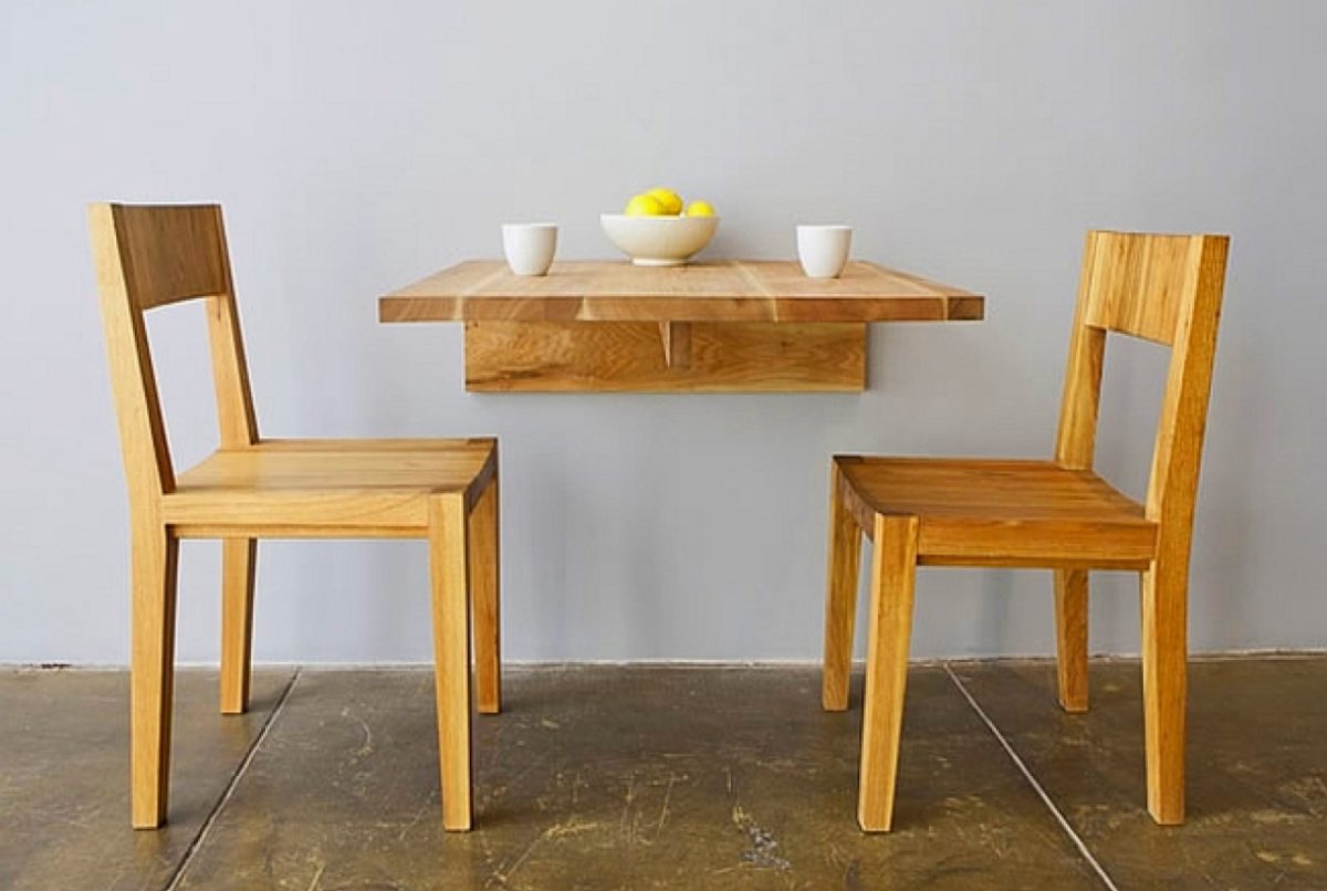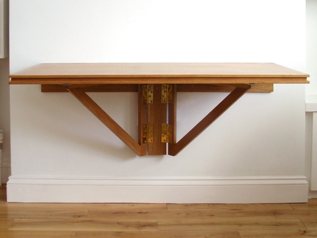 Откидной столик с креплением к стене — столешница, зафиксированная специальным треугольным либо прямоугольным крепежом. В закрытом состоянии эта конструкция выглядит как небольшая планка. В разложенном — представляет собой обычный обеденный стол, идущий от стены.