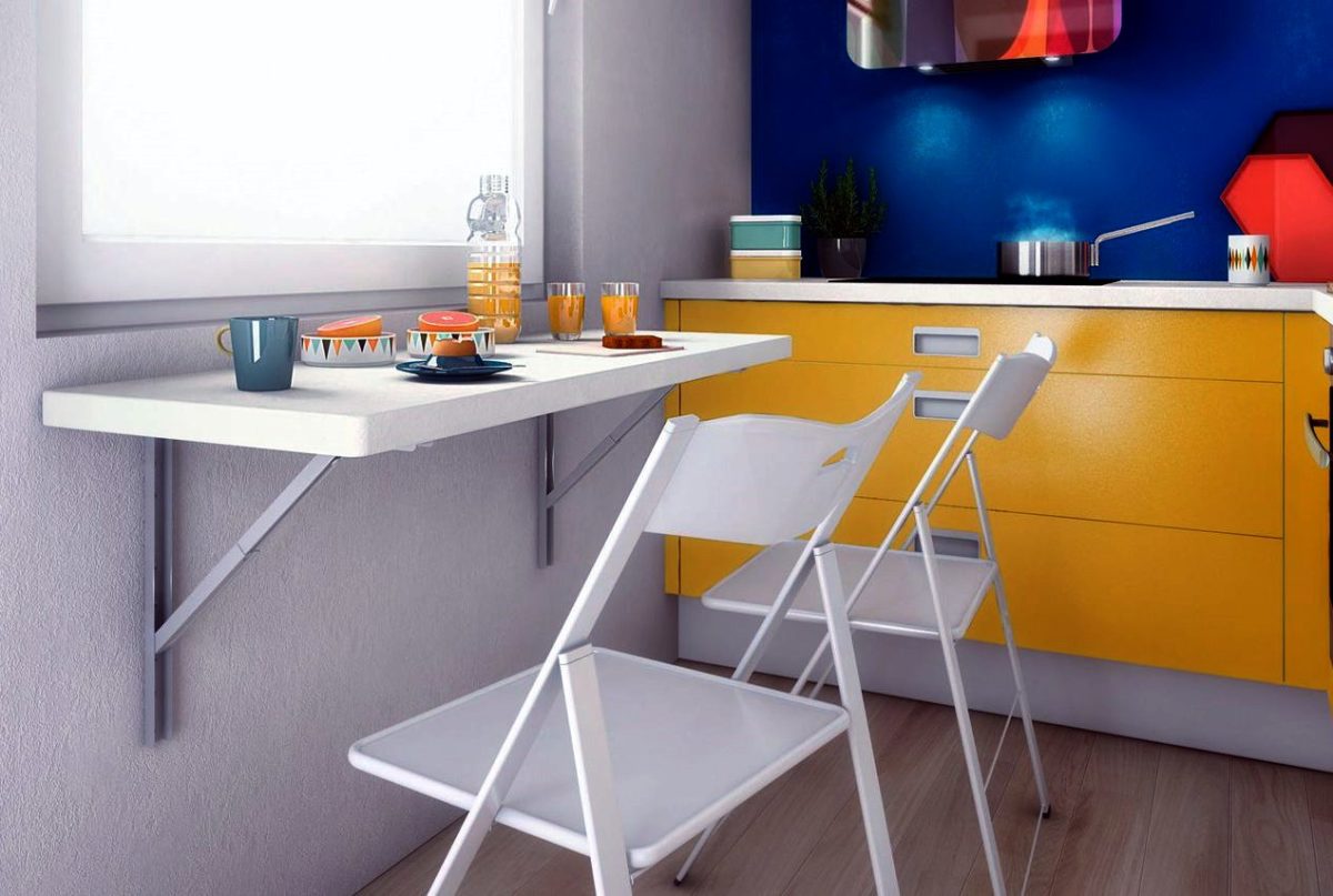 Такой вариант отличается максимально компактными размерами и многофункциональностью. Он очень удобен в эксплуатации, а поднятие столешницы и складывание не занимает много времени. Откидной столик на кухню часто покупают владельцы хрущевок. Мебель отлично вписывается в интерьер подобного помещения, может иметь полукруглую или прямоугольную форму, занимает минимум пространства.