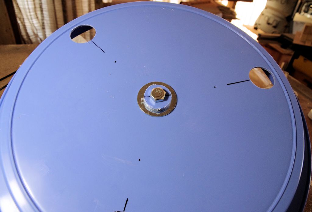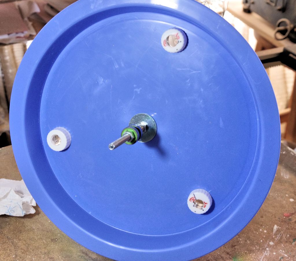 Теперь закрепляем бутылки на подносе. Их нужно просто прикрутить, как показано на третьем и четвертом фото. Открытое «лицо» бутылок должно быть повёрнуто перпендикулярно краю подноса. все три бутылки должны быть развернуты одинаково относительно центра и краев подноса (пятое фото). То, в какую сторону будут развернуты бутылки, определит будут они крутиться по часовой стрелке, или же против. Турбина на пятом фото будет крутиться по часовой стрелке.