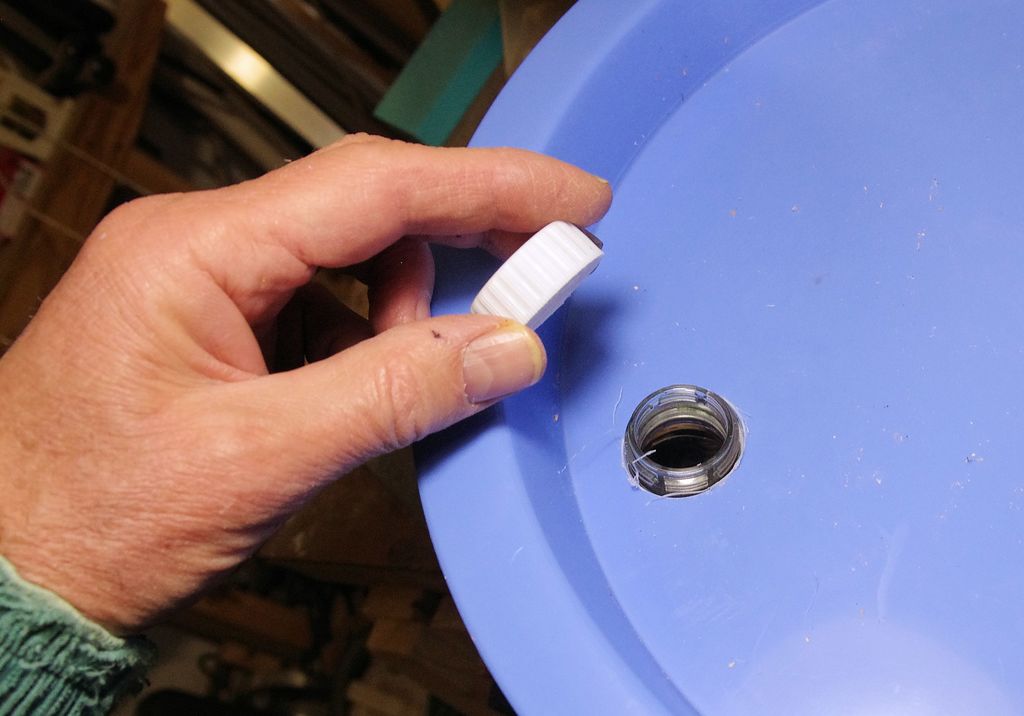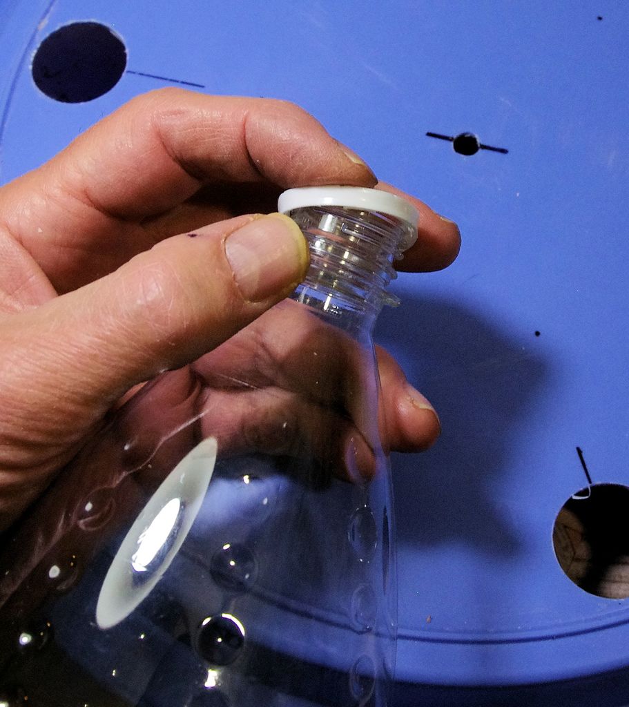 - Пробка наворачивается на горлышко емкости фюзеляжа. На саморез надевается сначала винт, потом шайба. Саморез заворачивается в пробку.