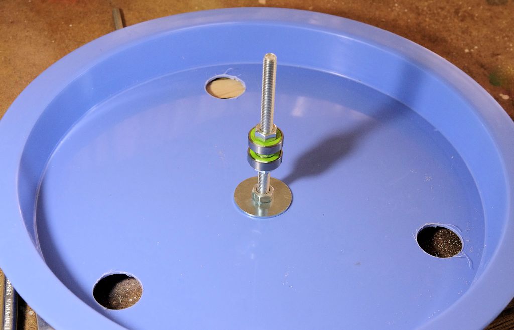 Сначала надеваем на болт шайбу и поднос нижней стороной к головке (первое фото), поднос будет расположен дном кверху, чтобы в нем не скапливалась дождевая вода. С другой стороны фиксируем поднос еще одной шайбой и гайкой. Потом на ось надеваем подшипники и гайки, в том же порядке, что и на втором фото. Расстояние между подносом и подшипниками зависит от высоты бортика подноса. Когда турбина будет крутиться, она не должна задевать основание, на которое установлена.