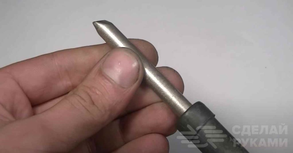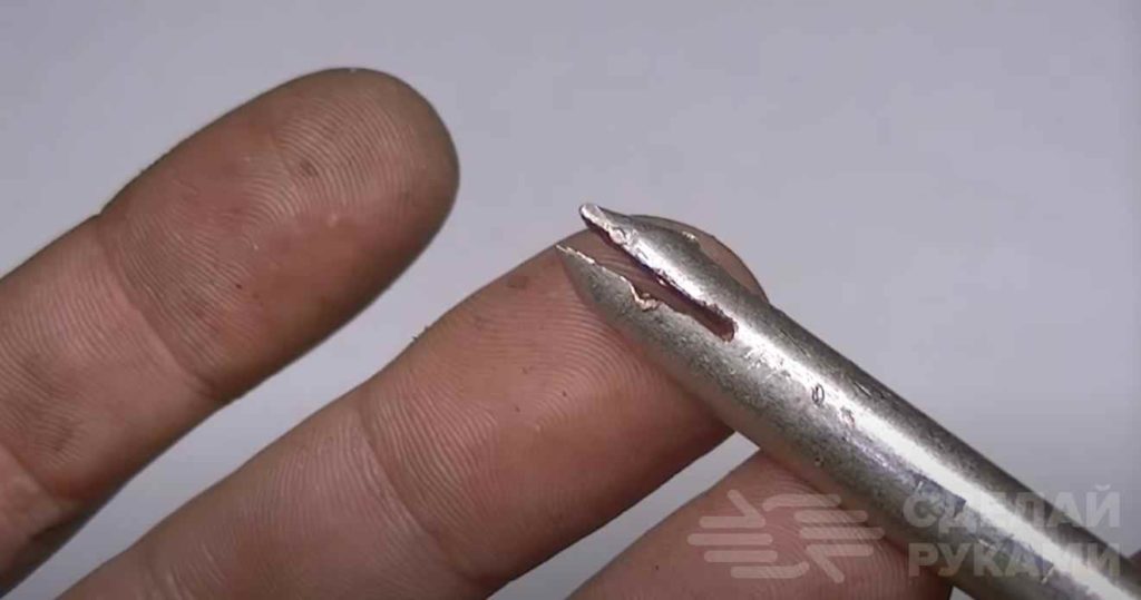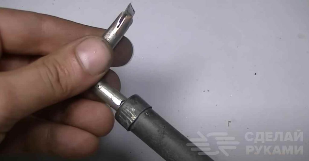 После этого ножовкой по металлу необходимо сделать в жале паяльника продольный пропил глубиной 10 мм.