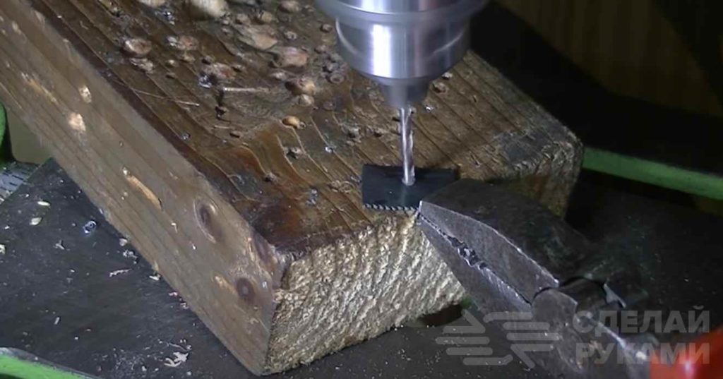 Для облегчения последующей обработки заготовки ножовочное полотно необходимо нагреть (сделать отпуск металла). После охлаждения сверлим по центру отверстие диаметром 3 мм.