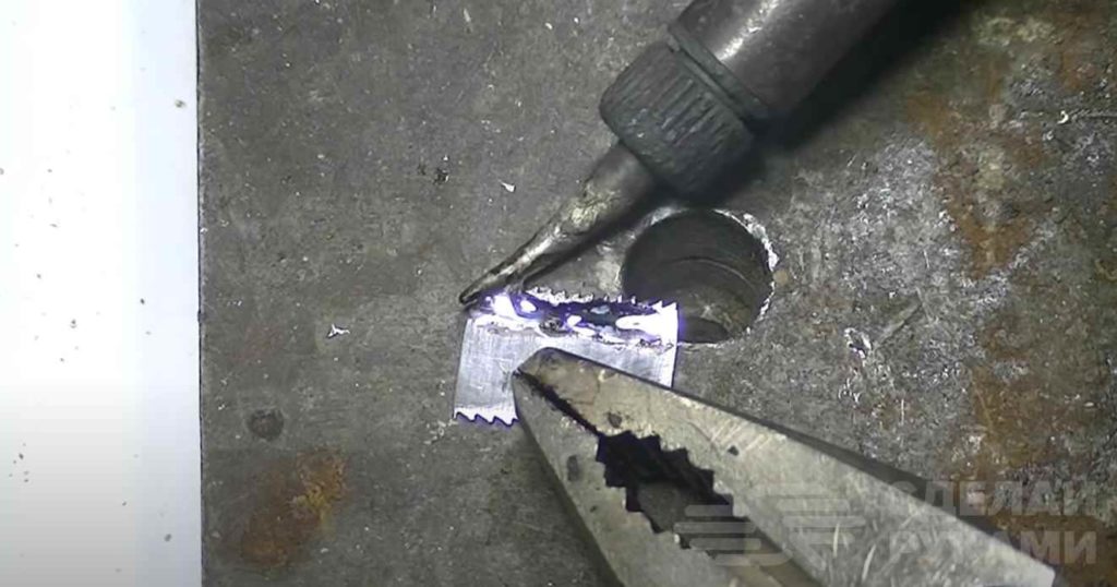 Край ножовочного полотна нужно облудить — для этого автор использует специальный флюс для пайки стали.