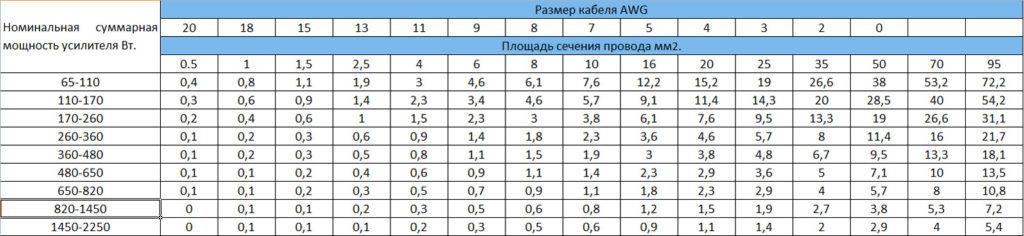 После того как вы посчитаете мощность желательно ещё определить длину провода от АКБ до вашего усилителя и можете смело воспользоваться таблицей для подбора нужного сечения провода. Как пользоваться таблицей? С левой стороны указана мощность вашего усилителя, справа выбираете длину провода, поднимаетесь наверх и узнаете какое сечение вам необходимо.