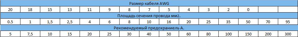 Последний нужен для того, чтобы защитить именно кабель, т. к. по нему идет немалый ток.Убедитесь, чтобы номинал предохранителей совпадал, так как если номинал предохранителя проводки будет очень большой, то в результате короткого замыкания может сгореть провод. Если номинал, наоборот, будет меньше, то предохранитель в момент пиковых нагрузок может легко сгореть и тогда не будет другого выхода, как покупать новый. В таблице ниже указано сечение провода, и необходимый номинал предохранителя.