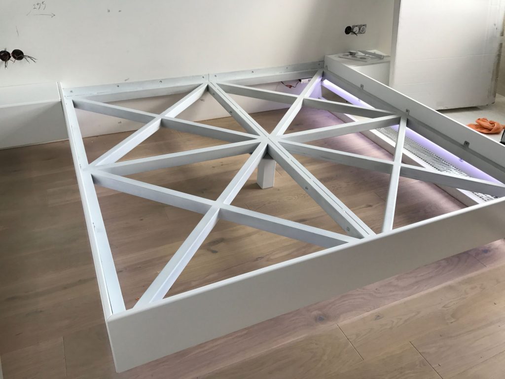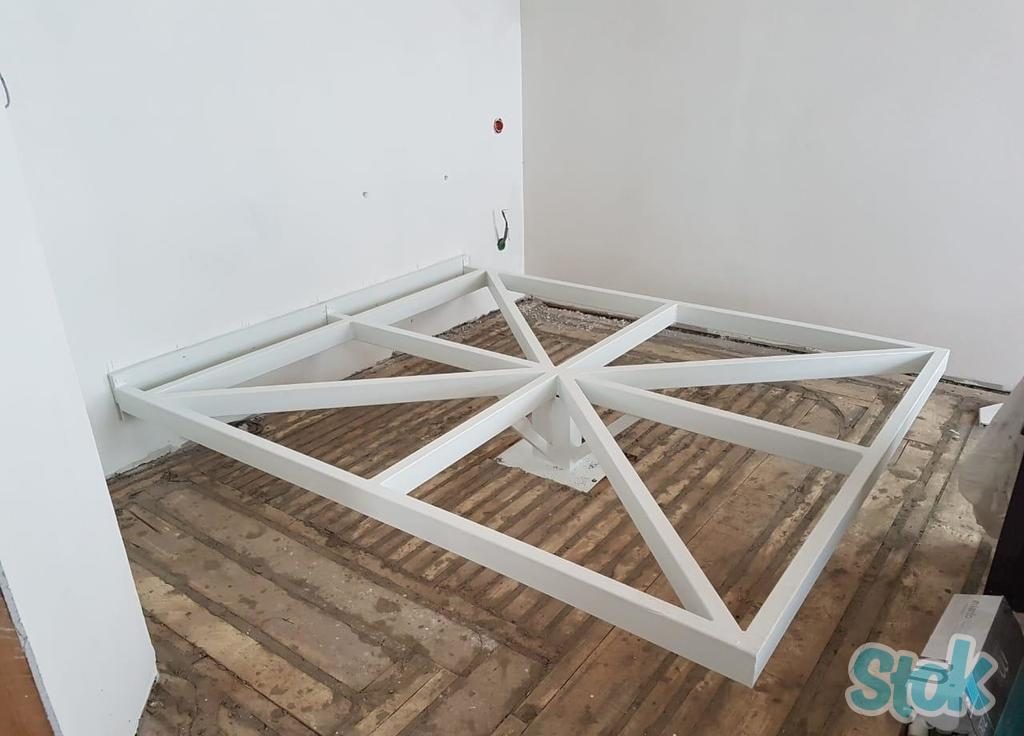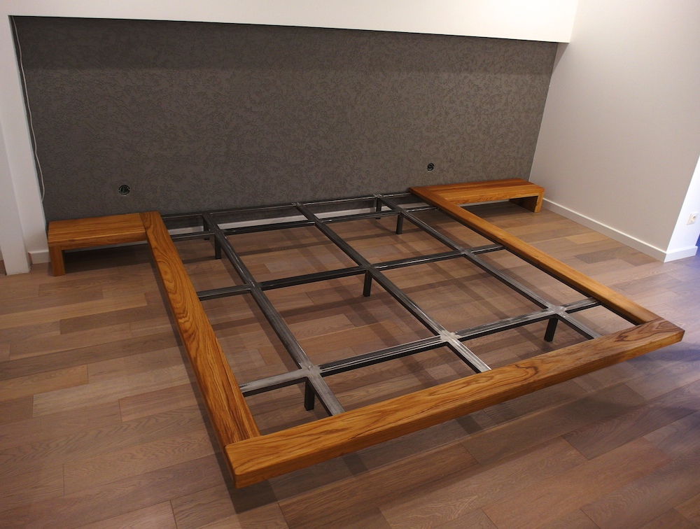 Рама-короб, куда укладывается матрац, должна быть собрана с высокой степенью прочности, так как нагрузки, которые она испытывает, существенно отличаются от обычных, возникающих на традиционных основаниях. Обычным решением является создание массивного изголовья с прикроватными тумбами или полками, объединенными в единый блок. Он крепится к стене и служит основанием для консольного крепления короба. В зависимости от используемого материала может быть создана одна опора по центру лежанки (в точке пересечения диагоналей). При этом, она должна иметь основание с достаточной площадью, чтобы не создавать слишком большого давления в одной точке. Такой вариант допустим при использовании металлической рамы, собранной на сварку или болтовые соединения.