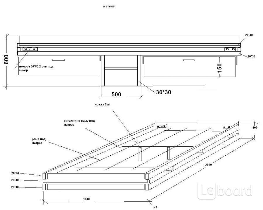Чертеж – сборка без него не получится. Нам лучше видеть, что и куда крепить, чем делать это вслепую. Чертеж упростит и ускорит весь процесс изготовления, и парящая кровать выйдет как надо.
