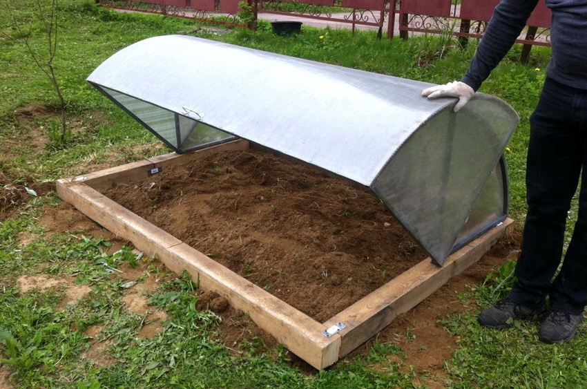 Верхняя крышка может полностью отрываться, и доступ к рассаде получается удобный. Но такая конструкция не позволяет высаживать высокие растения. Ее размеры могут быть разными, все зависит от размеров грядки и финансовых возможностей человека.