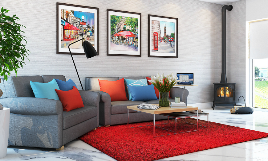 Так вы визуально расширите гостиную, создавая ощущение простора. Для комнаты средних размеров подходит вариант оформления в одном цвете либо с использованием нескольких контрастирующих элементов, не перегружающих интерьер.