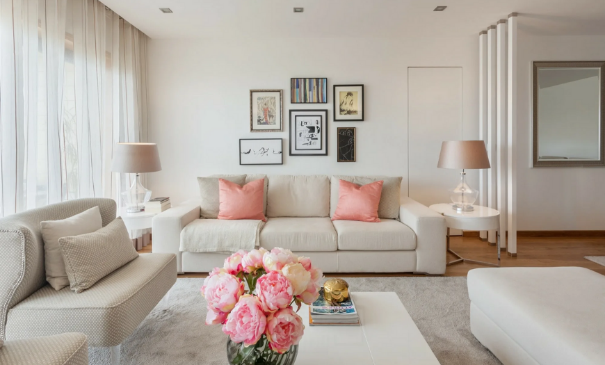 Белый фон дополняют персиковыми, коралловыми, лососевыми аксессуарами и мебелью. К ним подбирают текстиль контрастных цветов.