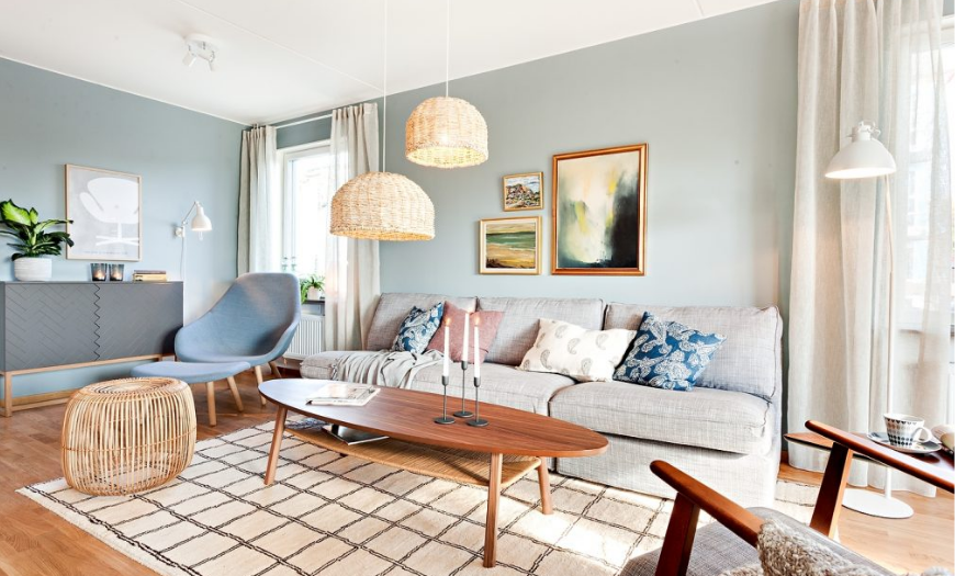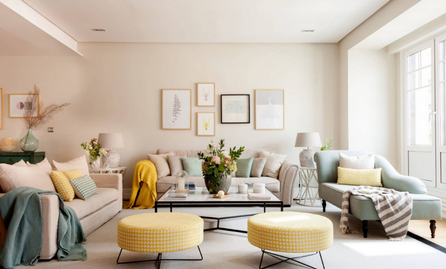 Светлая гостиная раскрашена в разные оттенки пастели