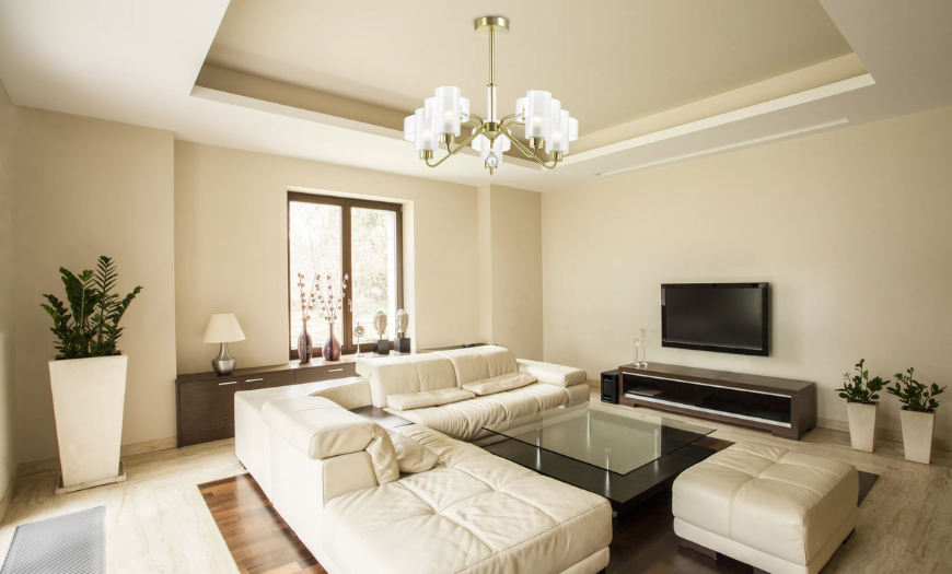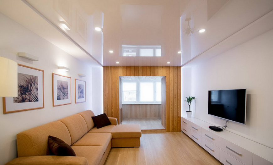 Универсальный вариант – светлый потолок, сочетающийся с любой мягкой мебелью, стенами, полом. Может быть матовым или глянцевым.