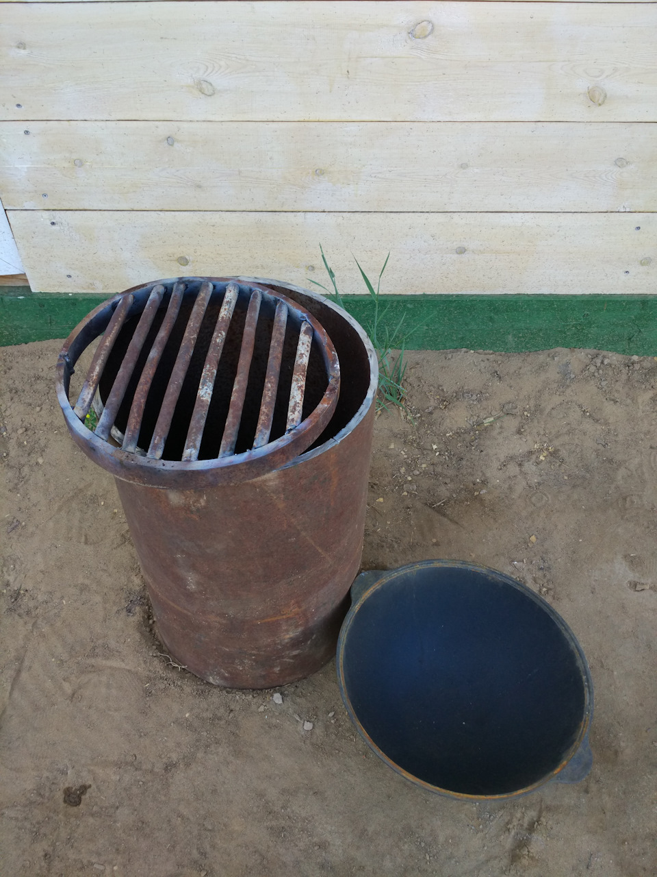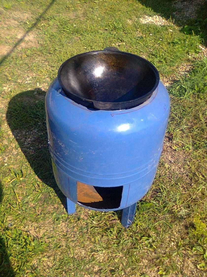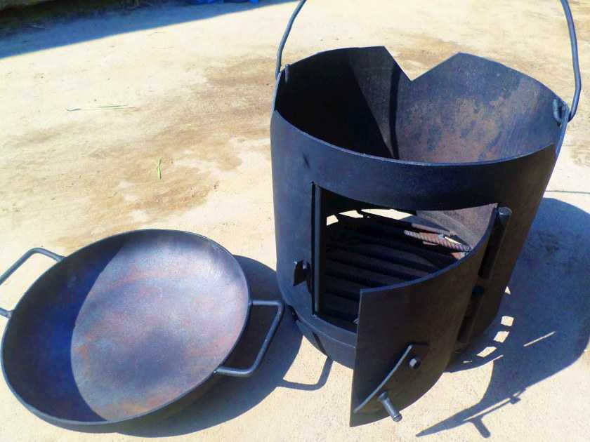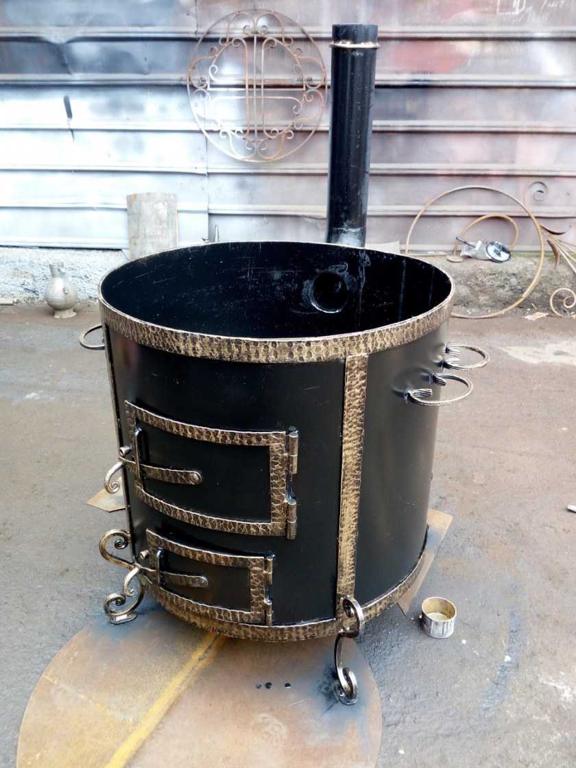 В продаже есть немало заводских недорогих моделей, но это как раз тот случай, когда можно обойтись своими силами и почти гарантированно добиться успеха. Сделать железную печь под казан своими руками можно из любого цилиндрического предмета, скорее всего, не понадобится даже сварка.