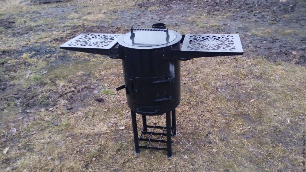 Печь, предназначенная для приготовления кулинарных изысков в казане со стороны, напоминает цилиндр. В качестве опоры для основы должны быть массивные ножки, чтобы они могли выдержать массу казанка с едой в нем.