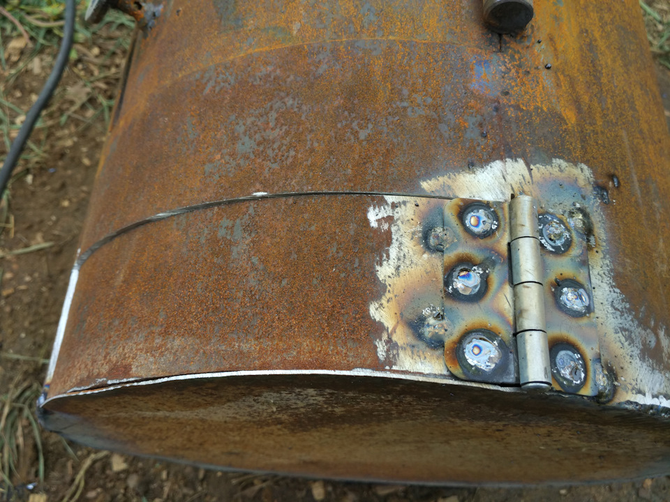 - Затем на заранее приваренных петлях крепится дверца с ручкой.