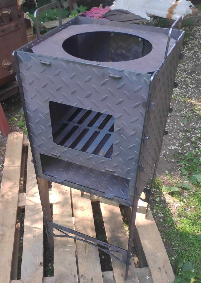 Простота конструкции позволяет сделать печь небольшого размера. В этом случае печь становится мобильной. Если смотреть упрощенно, то это кусок металлической трубы, по форме похожий на печь-буржуйку, только без верха (если он отсутствует, его заменит казан). Размеры печи — произвольные. Диаметр казанов, которые ставятся на печку, можно регулировать при помощи переходных колец. Кольца добавляются, или убираются, в зависимости от диаметра казана.