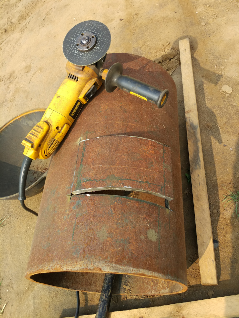 Если устройство создаётся из бочки или баллона, то необходимо срезать верхнюю часть, чтобы получилось гнездо для котла. В печах для казана из трубы болгаркой насекают верхнюю часть (глубина пропилов – несколько сантиметров). Полученные лепестки немного отгибают наружу, так получается посадочное место для котла. Иногда обходятся несколькими угловыми или прямоугольными вырезами (прогарами), через которые дым будет выходить наружу.
