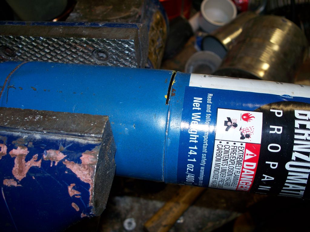 Итак, я взял пустой газовый баллон и зажал его в тисках. Ножовкой я обрезал его по сварному шву и срезал края. Если вы посмотрите на дно, вы увидите 4 отверстия. Используйте маркер, чтобы разметить линии на уровне с ними.