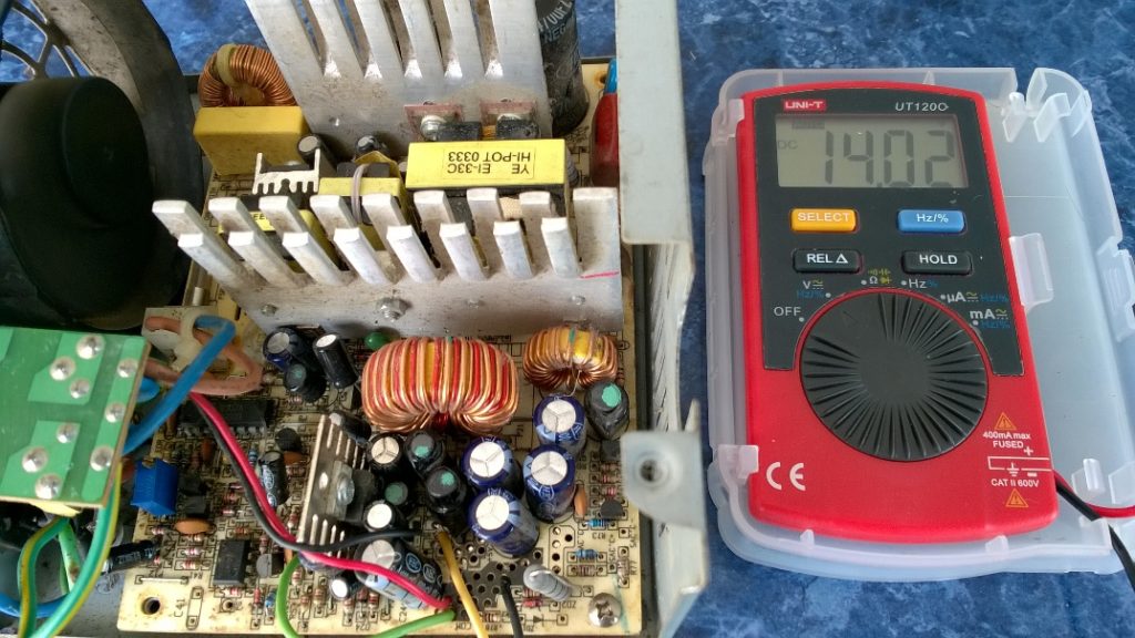 Финишным этапом будет поднятие напряжения до 14,0 В с помощью регулировки подстроечного резистора. Выше 14,0 В напряжение не стоит подымать на этом БП без дальнейших изменений схемы, т.к. уже при напряжении 14,2 В будут наблюдаться проблемы с запуском блока. А 14,0 В это вполне достаточно для зарядки автомобильного АКБ.