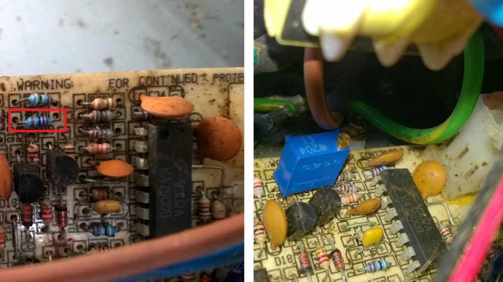 - Вместо демонтированного элемента устанавливается подстроечный резисторный компонент на 22 кОм, но перед впаиванием его следует настроить на 18 кОм. Аккуратно запаяйте деталь, чтобы не повредить другие элементы схемы.
