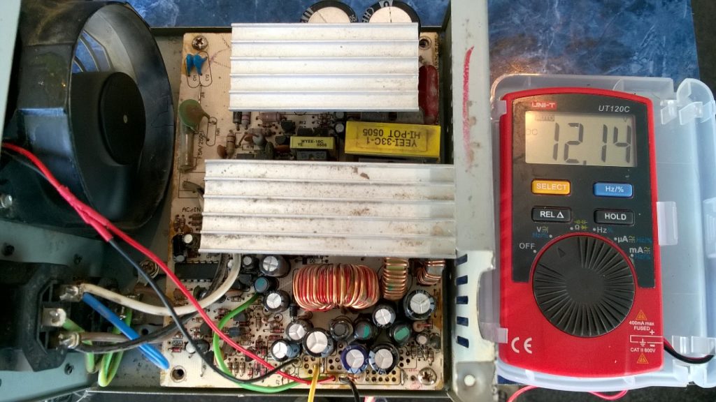 Запускаем блок питания. На выходе напряжение должно быть около 12 В.