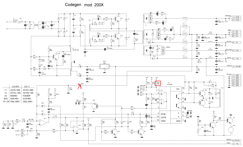 На схеме Codegen 300X находим резистор, через который первая нога TL494 соединяется с шиной +12 В., на схеме он помечен красным.