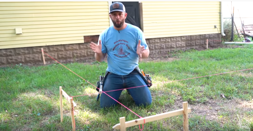 Для начала необходимо разметить территорию. Для этого понадобится несколько кольев и прочная бечева. Колышки забиваются по углам конструкции и в серединах длинных пролетов, после чего между ними натягивается веревка. Все углы точно выверяются и проверяются. В квадратных и прямоугольных формах проверка выполняется сравнением диагоналей.