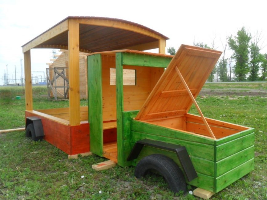 - Следующим шагом идет изготовление крышки. Щит не лучший вариант. Оптимально остановиться на трансформере. Здесь тоже существует выбор. Разложенная крышка способна превращаться в две скамейки или лавку и столик. Чаще всего популярен первый вариант.