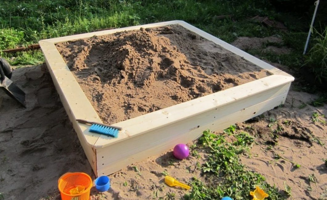 Далее заполняем песочницу любым песком – для этих целей чаще всего используется речной или кварцевый песок. Вот и все, песочница готова!