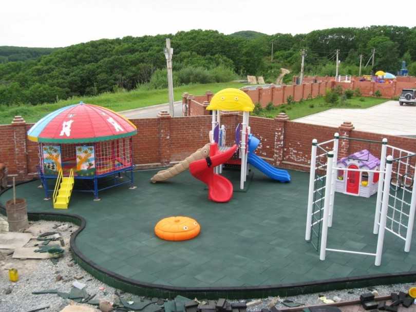 резиновая плитка – один из самых современных вариантов. Материал абсолютно безопасен для ребенка, пружинит, смягчает падения, не пачкает, прост в уборке, пропускает воду и быстро высыхает. Плитку выпускают разных цветов и даже с веселыми рисунками – отличное решение для детской площадки. Уход за покрытием будет минимальным, ведь оно долговечное, не истирается, а укладывать его можно практически на любую ровную поверхность и даже грунт;