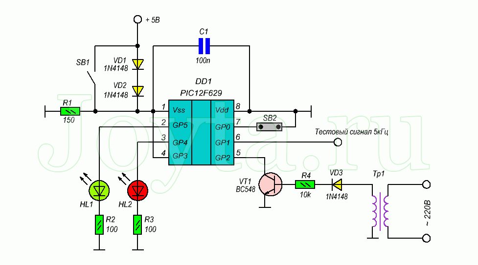 Частота внутреннего генератора в микроконтроллере PIC12F629 и PIC12F675 может незначительно меняется от изменения температуры и напряжения питания. По мере увеличения напряжения питания, частота его немного уменьшается. Когда переключатель SB1 не замкнут, напряжение питания 5 вольт, пройдя через два диода, которые создают падение напряжения около 1,6 вольта, поступает на вывод питания ПИКа (3,4 вольт). С замкнутыми контактами SB1, микроконтроллер работает от 5 вольт. С помощью данной схемы появляется возможность для калибровки либо на 3,4 вольт, либо на 5 вольт питания.
